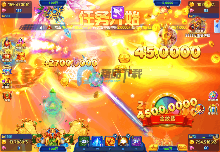 武器类型:游戏提供多种炮台,如机枪、激光束、散弹炮、能量炮等,每种炮台发射的炮弹威力不同,花费的金币也不同。例如,激光炮具有贯穿打击效果,适合捕捉密集鱼群;散弹炮能同时发射多枚炮弹,增加命中率。