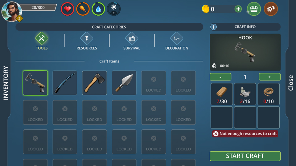 3.多样生存要素:不仅要收集资源制作物品,还需获取食物、淡水,时刻防范鲨鱼,增添生存挑战与趣味。